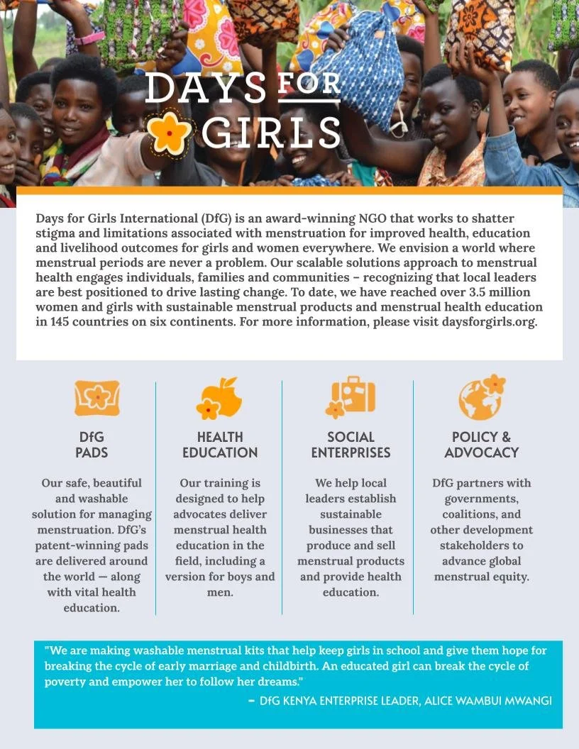 Days for Girls increases access to menstrual care and education by developing global partnerships, cultivating Social Enterprises, mobilizing volunteers and innovating sustainable solutions that shatter stigma and limitations for women and girls.